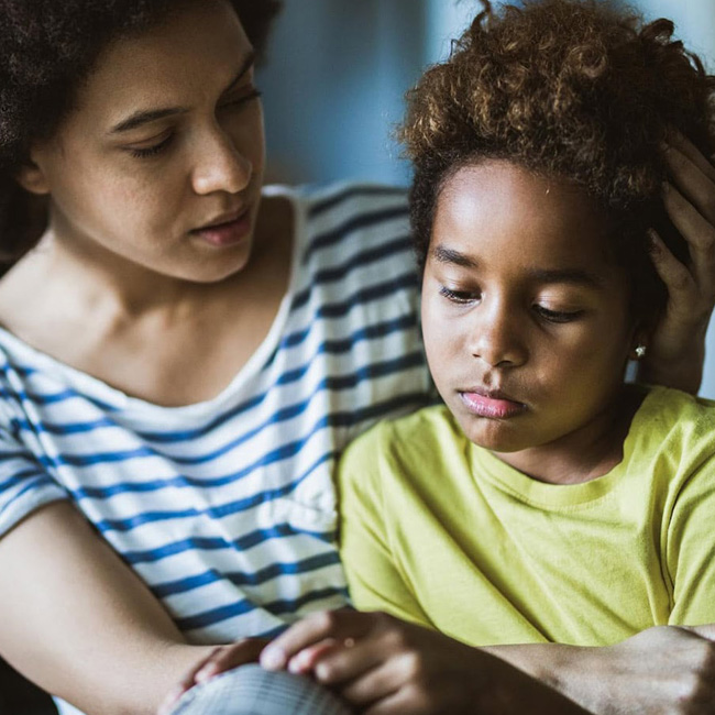 Mother consoling a young boy who is looking sad