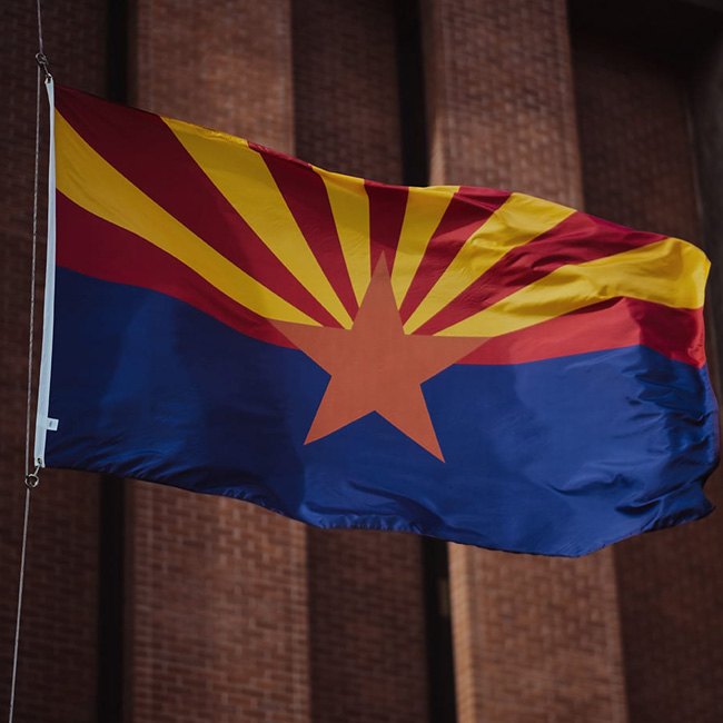 Image of the Arizona State Flag waving in front of a building